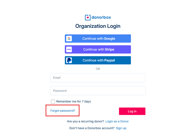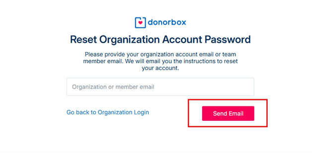 1. Activate your account by choosing the option “Forgot password.” Enter the email address you used when you first filled out the online donation form. Then, click “Send email.”