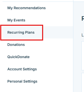 4. In the left-hand menu, click on Recurring Plans to access your monthly giving settings. You can change your contact information, credit card details, the amount you wish to donate each month, or cancel your contribution.